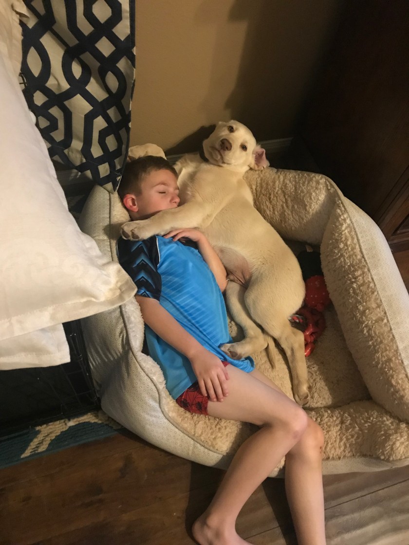 After working at the school in the special education department and having a child on the spectrum I now see the need and such uses for therapy/service dogs. Growing up we always had labs, but they were not our “pets” they were my dad’s bird dogs. They lived outside in the kennel and plus my brother was very allergic to animals so regardless if they were pets or not they were not coming in the house. About 3 years ago a friend of ours dog was going to have lab puppies and asked us if we would want one, my first reaction was hell no! I don’t want a giant dog in the house. Plus my husband is allergic and if I get a dog it will live in my house and that is going to be so much work to keep my husband breathing easy lol. A few weeks went on and my kids begged and begged, I did finally give in and I said yes BUT…….. I want a chocolate female and I want to name her Hazel. Hahahha……I know it’s kinda crazy but I had this image in my mind and oh my goodness does it ever fit her. She is the best dog ever. She has the best temperament and and so loving and she is just perfect. She was perfect for Nowlin, as she got older she and Nowlin formed a bond that is unbreakable. She lets him lay on her and snuggle and she watches him play his video games, she is his buddy for sure. She is not a certified therapy dog but she is defiantly Nowlin’s therapy/buddy dog. Just this past December Hazel had her first litter of puppies and she had 12……yes 12 and all made it. That’s where Levi came from, he is one of her puppies. He was the first born and he was so big and giant and I fell in love with him the moment I set my eyes on him, he definitely takes after his momma. In the picture Nowlin was crying and would not stop to talk to me so I told him to go lay down with Levi, Nowlin was not sleeping in the picture he just had his eyes closed. Calmed down in no time. Melts my heart. Anyhow since she had the puppies all I can think about is becoming a therapy dog trainer. How fun would that be? I mean…….helping others and teaching dogs to help others and how to be emotional support I just think it would be so humbling. #happyhazel #therapydog #dreamjob #labs #luckylevi #giantdog